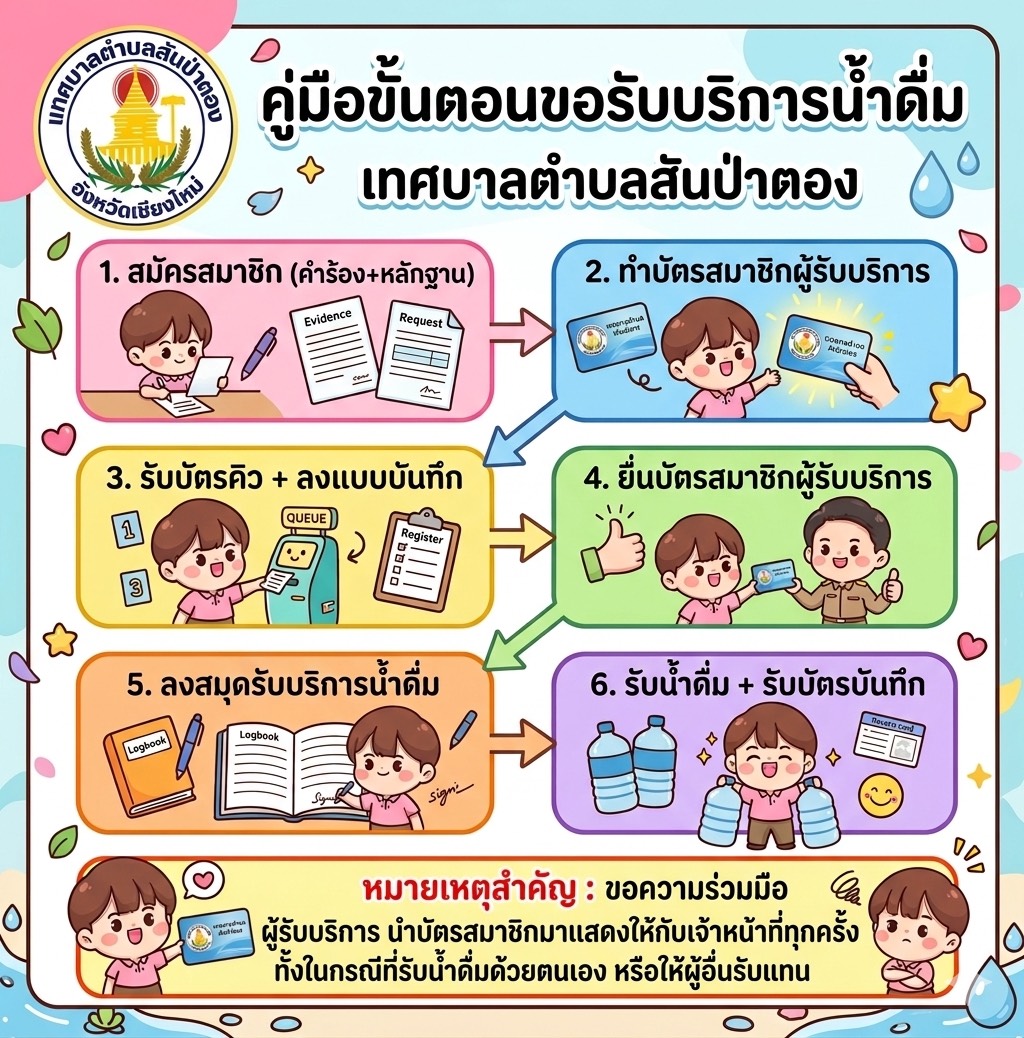 ประชาสัมพันธ์ระเบียบและขั้นตอนการขอรับบริการโรงน้ำดื่มเทศบาลตำบลสันป่าตองเพื่อให้การบริการน้ำดื่มเป็นไปอย่างทั่วถึงและเป็นระเบียบ เทศบาลตำบลสันป่าตองขอแจ้งรายละเอียดการรับบริการ